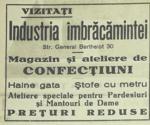 Pe strada Domnească, Casa de confecțiuni „Toto” își anunța colecția de toamnă și promitea reduceri substanțiale, mizând pe croieli actuale și livrare rapidă. În același registru, „Industria Îmbrăcămintei” de pe strada General Berthelot își informa clienții că dispune atât de stofe la metru, cât și de haine gata făcute. Atelierele speciale ale magazinului executau pardesie și mantouri de damă, toate „la prețuri reduse”, după cum se accentua în anunțuri.
