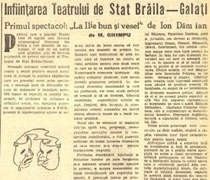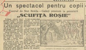 Activitatea Teatrului de Stat Brăila-Galați a început cu premiera piesei „La Ilie bun și vesel”, în timp ce pentru educarea tineretului a fost considerată a fi o „hrană sufletească sănătoasă” povestea „Scufița roșie” (Desrobirea, an. 4, nr. 1408, 14 mai 1949).