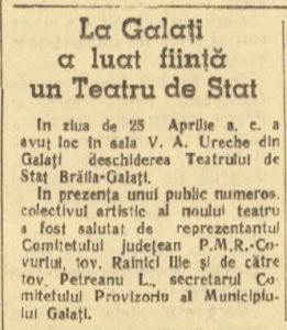 Astfel, în ediția din 19 februarie 1949, aflăm că, prin decizia Ministerului Artelor și Informațiilor, „la Galați, vom avea un Teatru de Stat permanent”. Mai surprinzător este faptul că în articol se afirma că Teatrul Poporului din București va deveni Teatrul de Stat, cu o conducere autonomă, și „va avea sediu permanent la Galați, unde va trece la împlinirea programului pe care urma să-l realizeze în Capitală”, iar „efectivul artistic, căruia i se vor adăuga și alte elemente alese prin concurs, se va deplasa la Galați până la sfârșitul acestei luni, urmând să-și inaugureze activitatea în orașul dunărean la 15 Martie”. Printre argumentele acestei decizii se enumera faptul că Galațiul are un număr mare de muncitori și nu a avut niciodată un teatru permanent. (Desrobirea, an. 4, nr. 1339, 19 febr. 1949).
