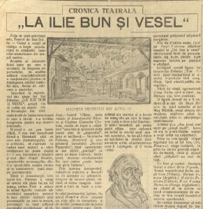 Piesa „La Ilie bun și vesel”, scrisă de Ion Damian, a avut premiera mai întâi la Brăila, în aprilie 1949, iar la Galați în luna mai 1949. Din cronică apărută în numărul din 22 mai al cotidianului Desrobirea aflăm și subiectul piesei, care reda „un aspect viu Revoluției din 1848, dezbrăcată de haina mincinoasă în care a căutat s-o învăluie burghezia”, acțiunea având loc în cârciuma lui Nea Ilie din mahalaua Dobroteasa, de unde și numele piesei. Confruntarea între revoluționarii adepți ai ideilor lui Nicolae Bălcescu și cei care se opun oricărei prefaceri sociale a fost redată pe scenă de actorii Dumitru Done, Ana Colda, Ion Aurel Manolescu, Neamțu-Ottonel, Virgil Vasilescu, Titu Vedea, Irina Barbu, Gh. Papa Nicola, Gh. Păunescu, Stela Popescu, Radu Anghelescu, Dorina Ionescu, Natalița Pavelescu, piesa fiind regizată de Victor Bumbești (an. 5, nr. 1415, 22 mai 1949).